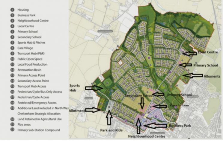 The development will take 20 years to build. It will see the largest ever swathe of greenbelt in the UK transformed into a new town, encompassing land in Swindon Village, Uckington and Elmstone Hardwicke.